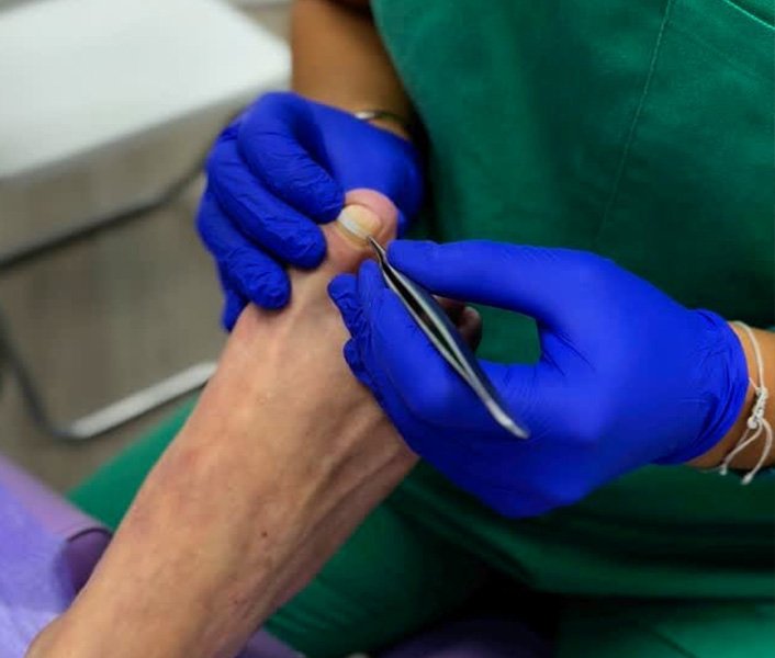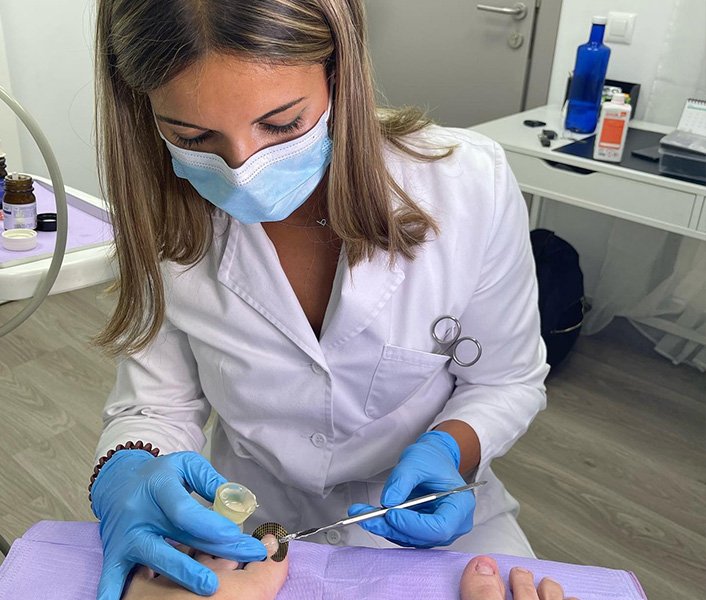 Tratamiento de uñas encarnadas, papilomas, micosis, hiperqueratosis, callosidades, alteraciones dérmicas y ungueales, helomas, durezas y verrugas plantares.